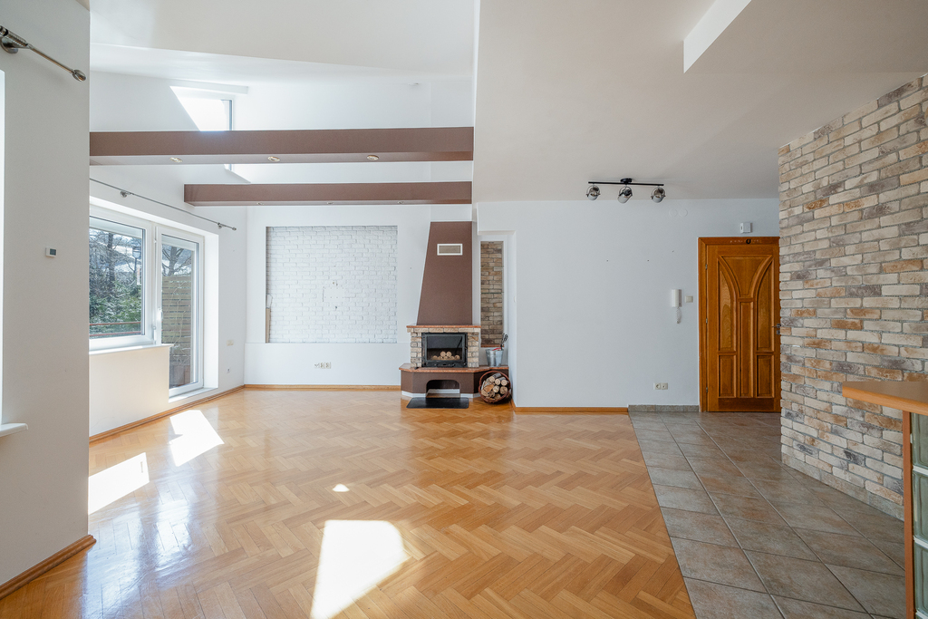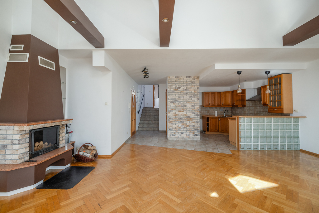 Dużym atutem jest kominek z rozprowadzeniem ciepła, który nie tylko tworzy klimat, ale realnie wspiera ogrzewanie całego mieszkania.