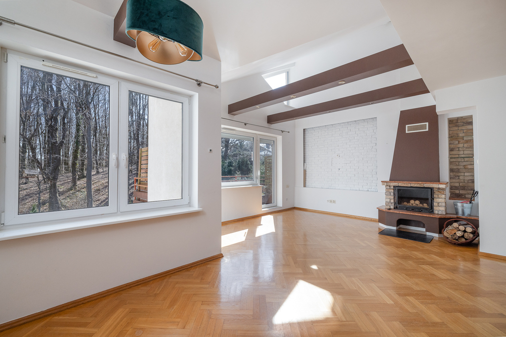 Naturalne światło, otwarta forma i bezpośrednie wyjście na balkon z widokiem na las budują wyjątkowy klimat – trudno o bardziej relaksujące miejsce po pracy.